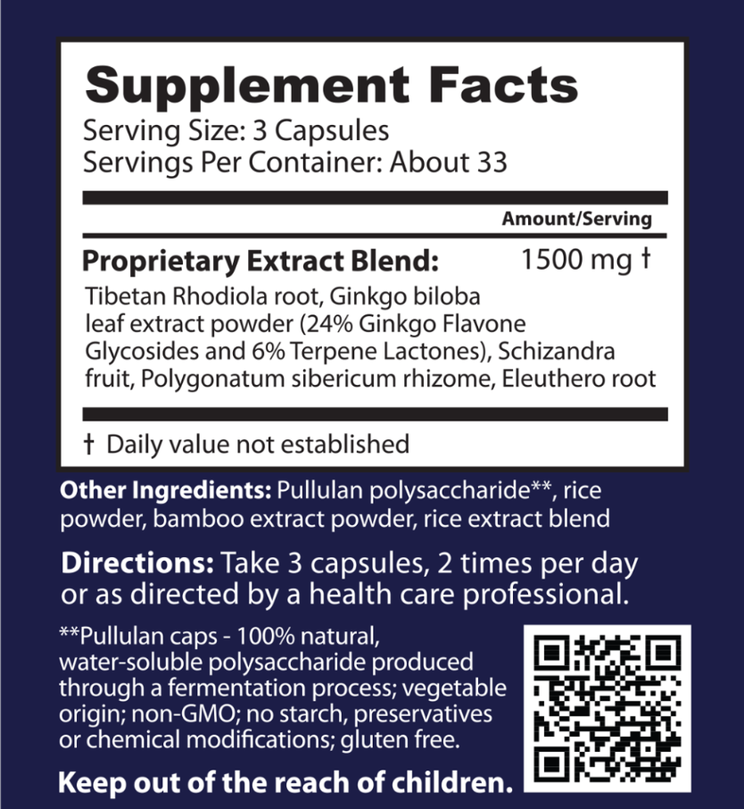 Ingredients: Tibetan Rhodiola root, Ginkgo biloba leaf extract powder (24% Ginkgo Flavone Glycosides and 6% Terpene Lactones), Schizandra fruit, Polygonatum sibericum rhizome, Eleuthero root.