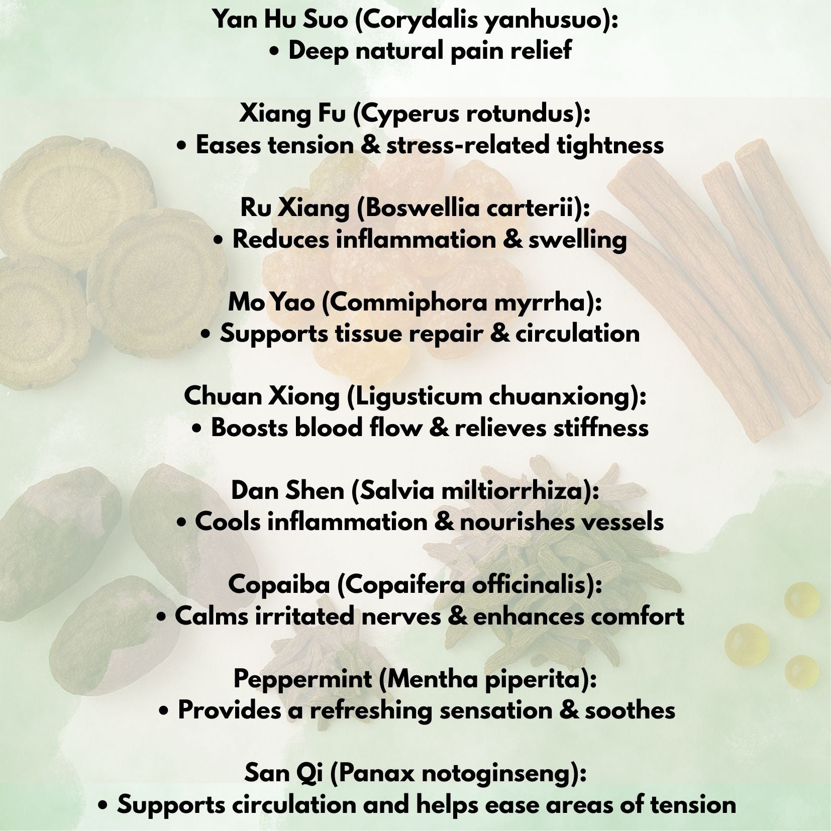 Butyrospermum Parkii (Shea Butter), Mangifera Indica (Mango) Seed Butter, Persea Gratissima (Avocado) Butter, Garcinia Indica (Kokum) Seed Butter, Simmondsia Chinensis (Jojoba) Seed Oil, Herbal Extracts: Salvia miltiorrhiza Root Extract (Dan Shen), Corydalis yanhusuo Extract (Yan Hu Suo), Cyperus rotundus Rhizome Extract (Xiang Fu), Boswellia carterii Resin Extract (Frankincense), Commiphora myrrha Resin Extract (Myrrh), Ligusticum chuanxiong Rhizome Extract (Chuan Xiong), Panax Notoginseng Root Extract (San Qi), Copaifera Officinalis (Copaiba) Oil, Mentha Piperita (Peppermint) Oil, Maranta Arundinacea (Arrowroot) Powder