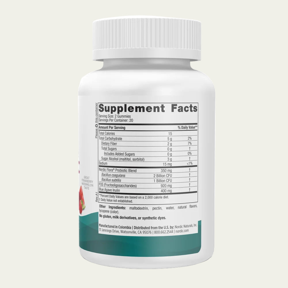 Support a healthy gut with just two tasty gummies a day.* This research-backed blend of probiotics + prebiotic fiber provides synbiotic support for digestive comfort and healthy immune function–served in delicious, strawberry-watermelon gummies with zero sugar.*